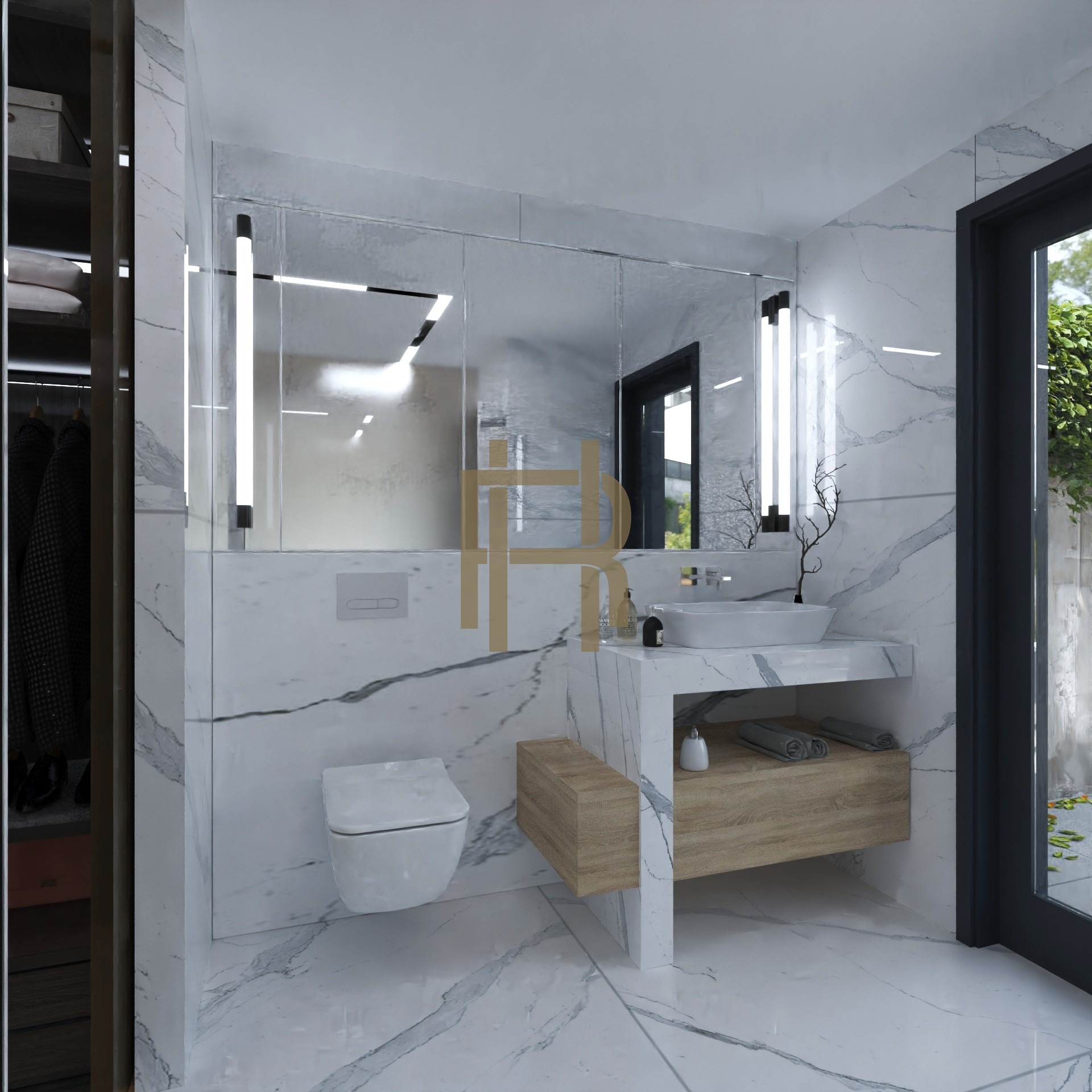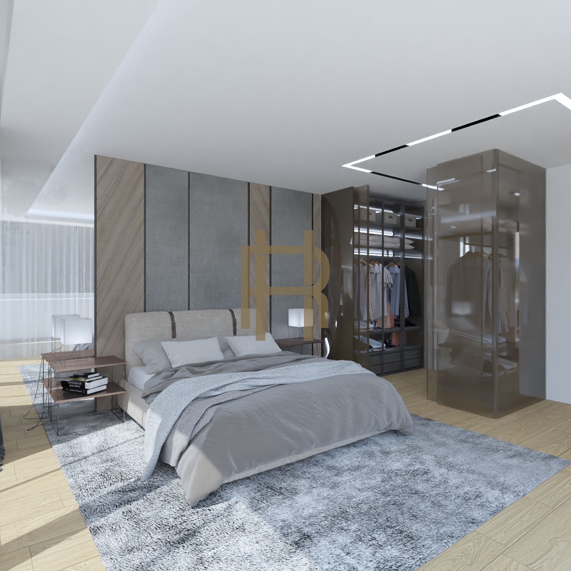 A szülői lakrész (Master Bedroom) a 36 m2-es felső szinten kapott helyet, mely saját fürdővel és üvegablakokkal határolt design gardróbbal rendelkezik. Az felső szint előteréből, hálójából és fürdőszobájából közvetlenül elérhető a hatalmas tetőterasz, ahonnan lenyűgöző zöldpanoráma nyílik a Budai hegyekre.