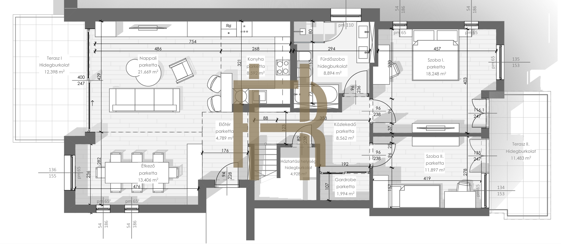Két teremgarázs hely és egy 8 nm-es tároló tartozik a lakáshoz, melyek az ár tartalmazza.