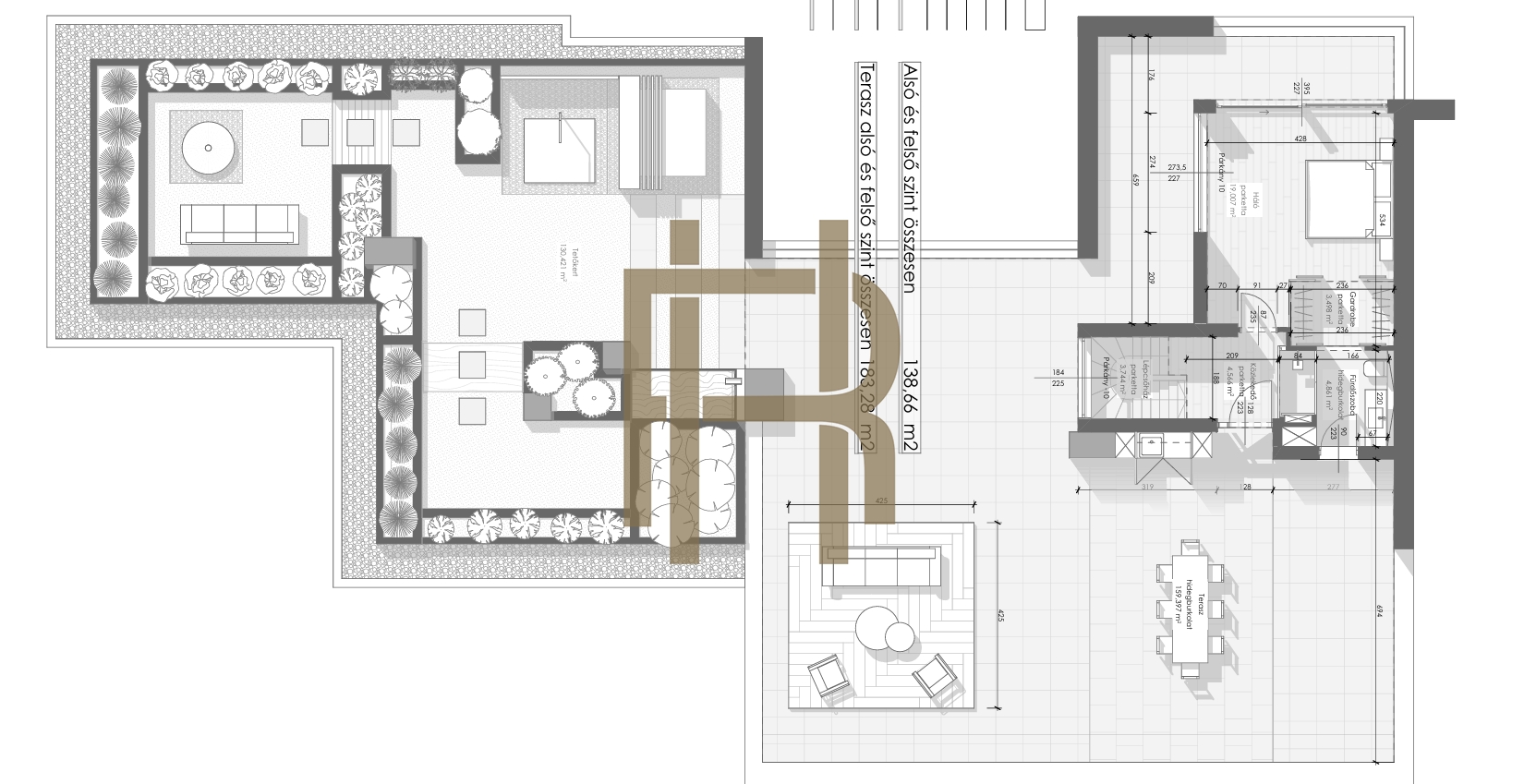 A lakáshoz tartozó hatalmas felső szinti terasz különlegesen igényes kialakítása tavasztól őszig óriásira tágítja a rendelkezésre álló teret, teraszként és kertként funkcionál egyszerre.