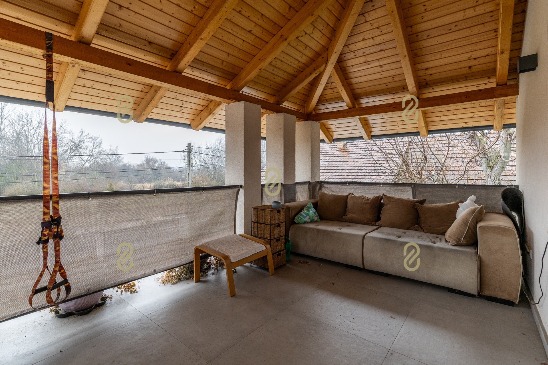 Az emeleten a két lakosztály mellett lehetőség van egy kisebb, külön nappali kialakítására is, amelyhez szintén fedett terasz tartozik – ideális lehet dolgozónak, társalgónak vagy a gyerekek külön birodalmának.