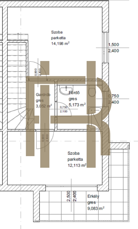 A 75 nm-es lakóterű lakások belső kétszintesek, nappali+2 hálószobásra lettek tervezve.
