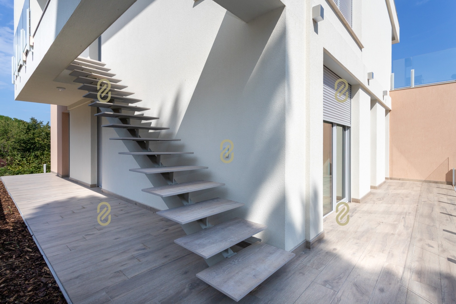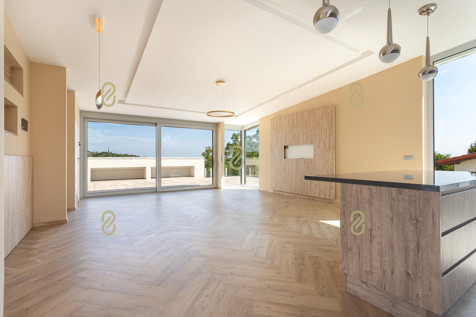 A nettó 190 m²-es hasznos alapterületű lakótérhez tartozik egy 48 m²-es panorámás tetőterasz hegyvidéki panorámával, valamint további 30 m² erkély, amelyek a hálószobákból nyílnak.