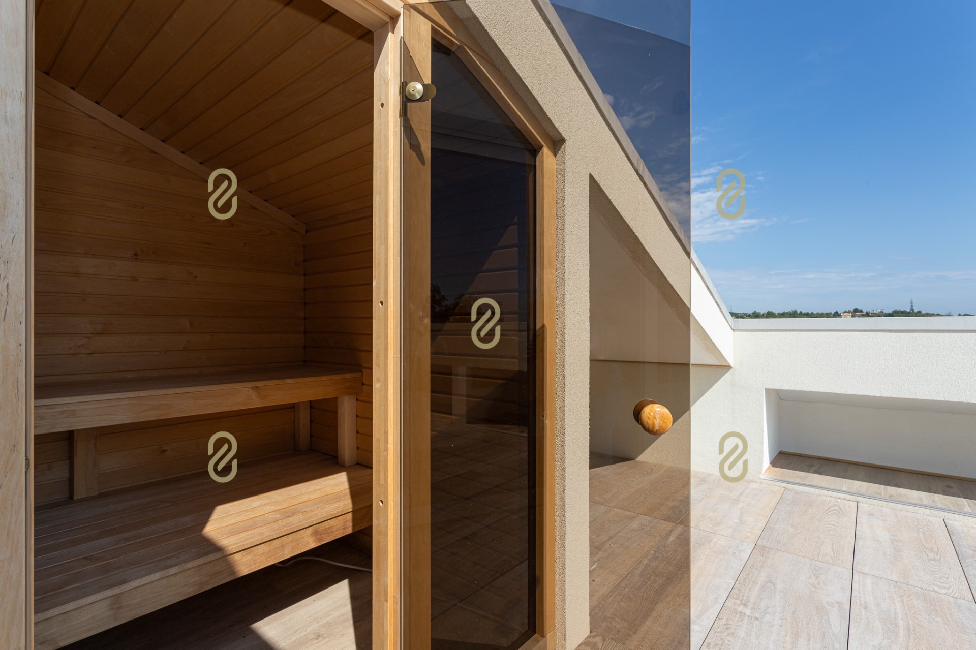 - Panorámás szauna a tetőszinten.