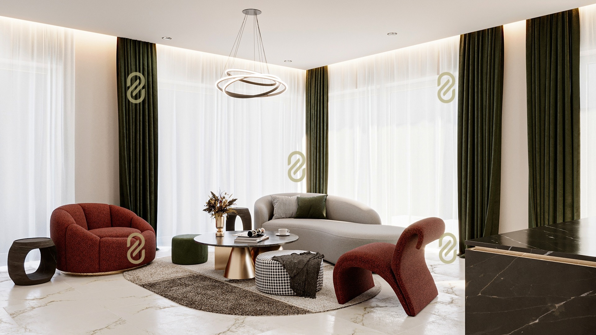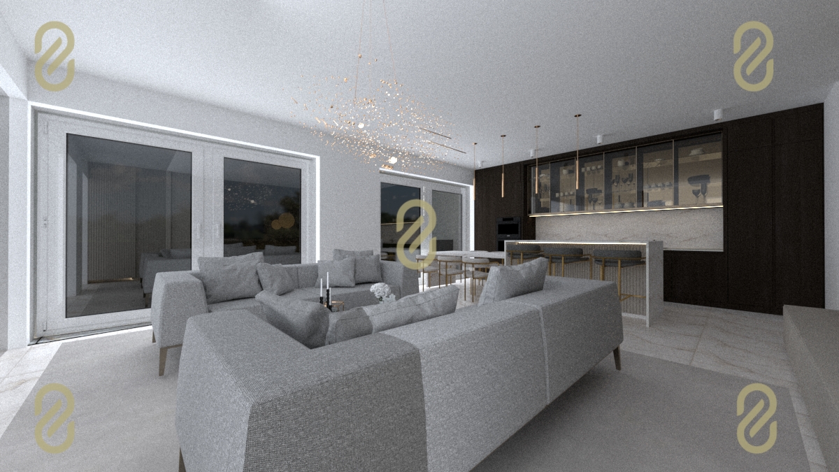 - Nappali nagy üvegfelületekkel, amely összekapcsolódik a privát kerttel,
