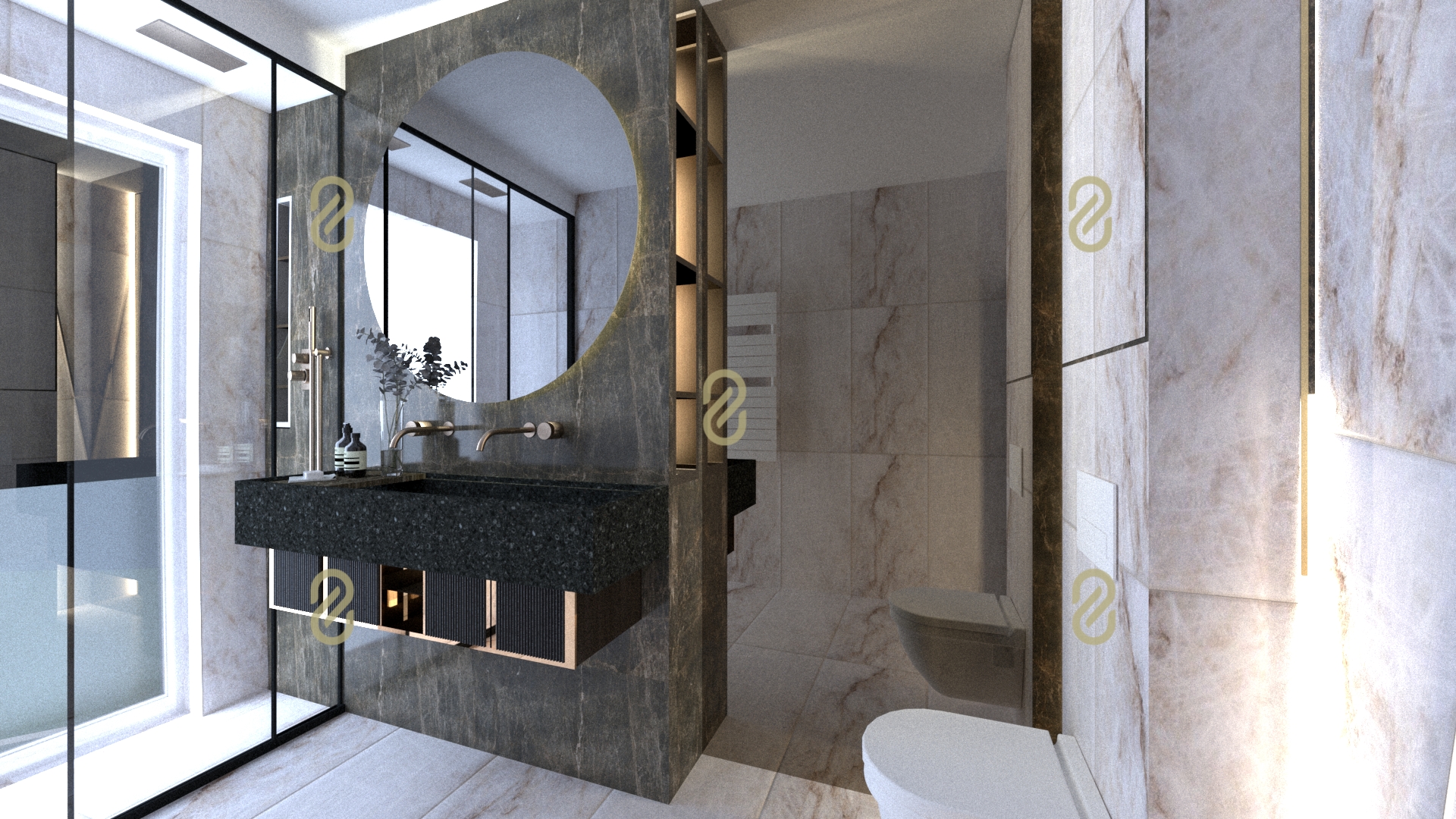 - Nagyméretű, exkluzív burkolatú fürdőszoba, amely garantáltan különleges élményt nyújt.