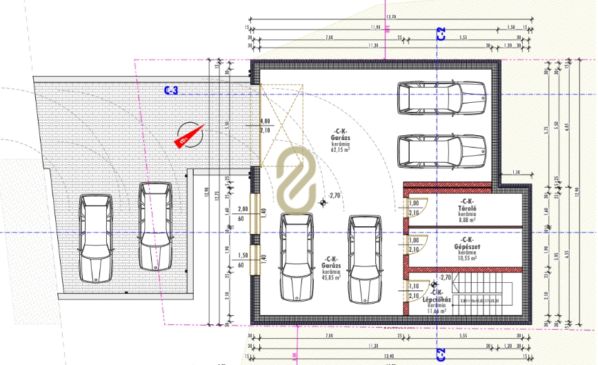 A parkolás a -1 szinten kialakított teremgarázsban biztosított, így a felszínen nagyobb, jól használható zöldfelület marad. Lakásonként egy garázshely biztosított, további parkoló és tároló vásárolható.