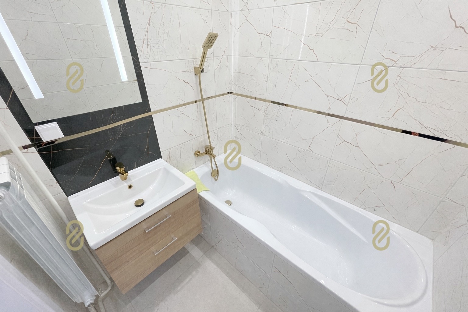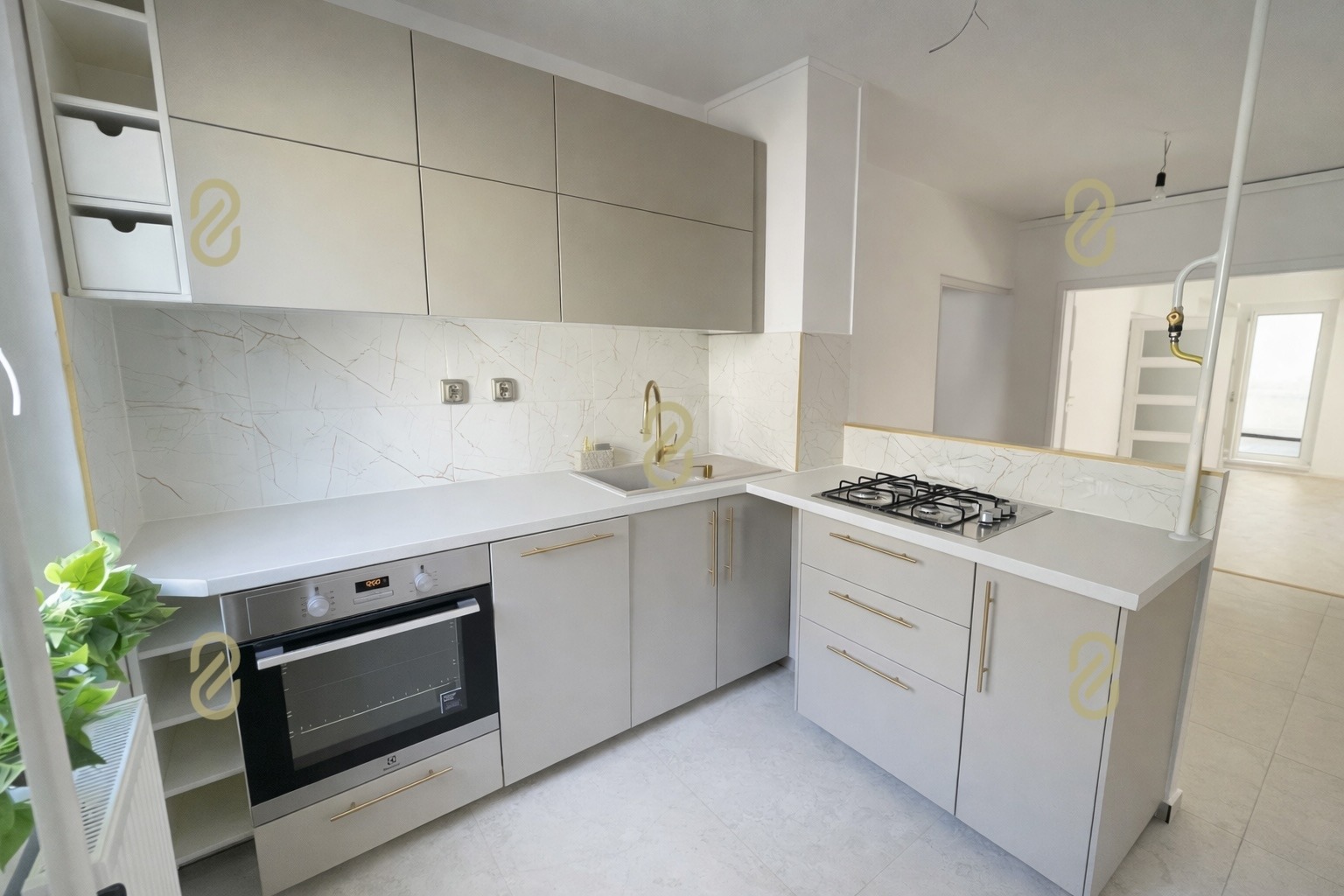 A modern konyha praktikus kialakítású és esztétikus, a fürdőszoba pedig elegáns burkolatokkal és minőségi szaniterekkel készült.
