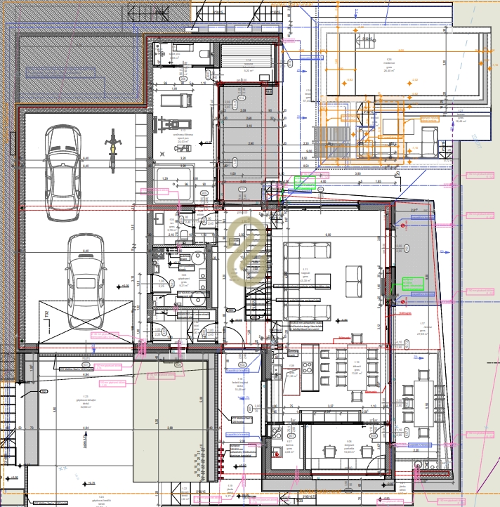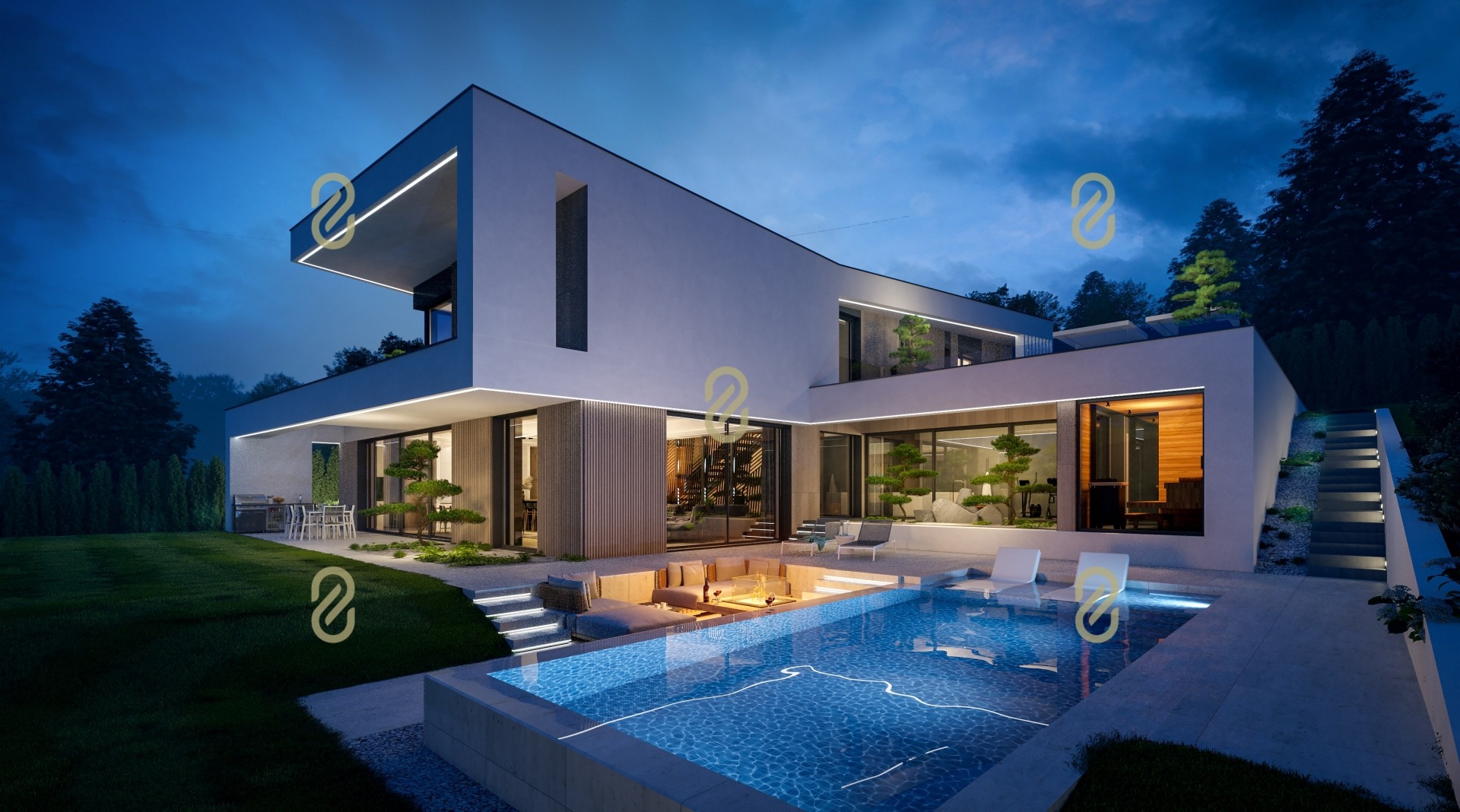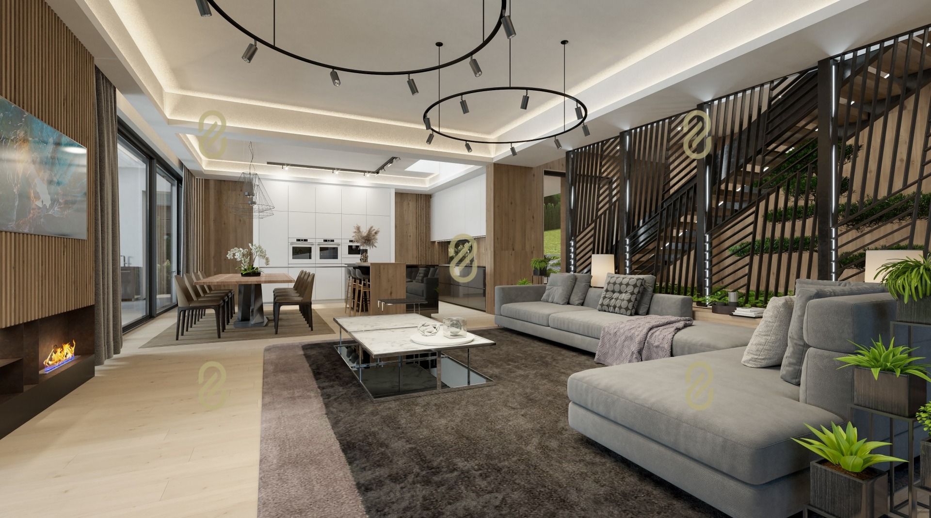 Az 1500 nm-es telek lehetőséget nyújtott a belső terek kialakításánál arra, hogy az átgondolt szerkezeti konstrukcióval olyan élettereket teremtsünk, amik a villa bármelyik pontjában izgalmas részletekre, lenyűgöző építészeti megoldásokra fókuszálnak.