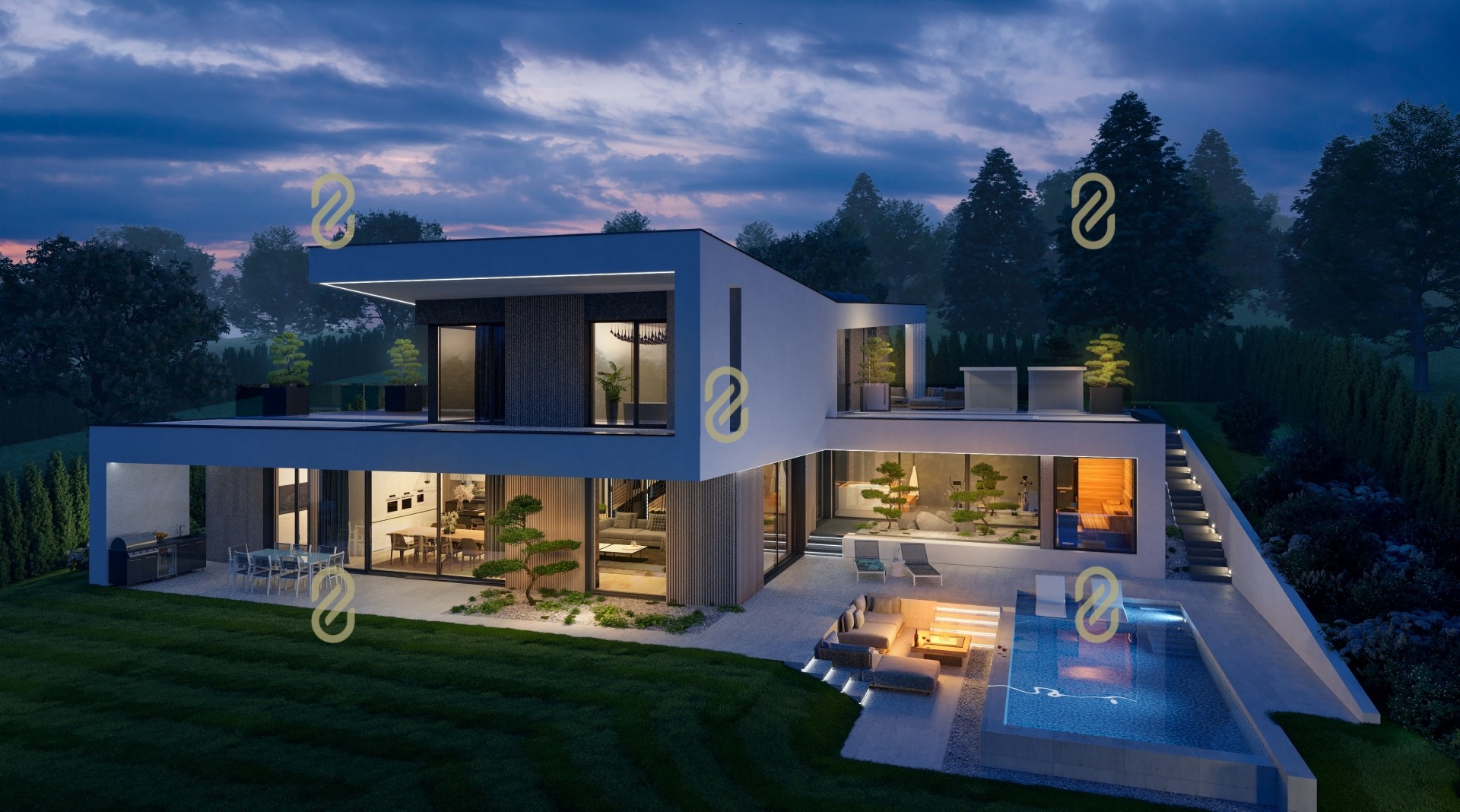 Az óriási üvegfelületek és a különböző szinteken található nagyméretű teraszok használatával a kint és bent érzés összemosódik, a természetközeliséggel pedig az otthonosság érzése erősödik, bárhol is vagyunk a villában.