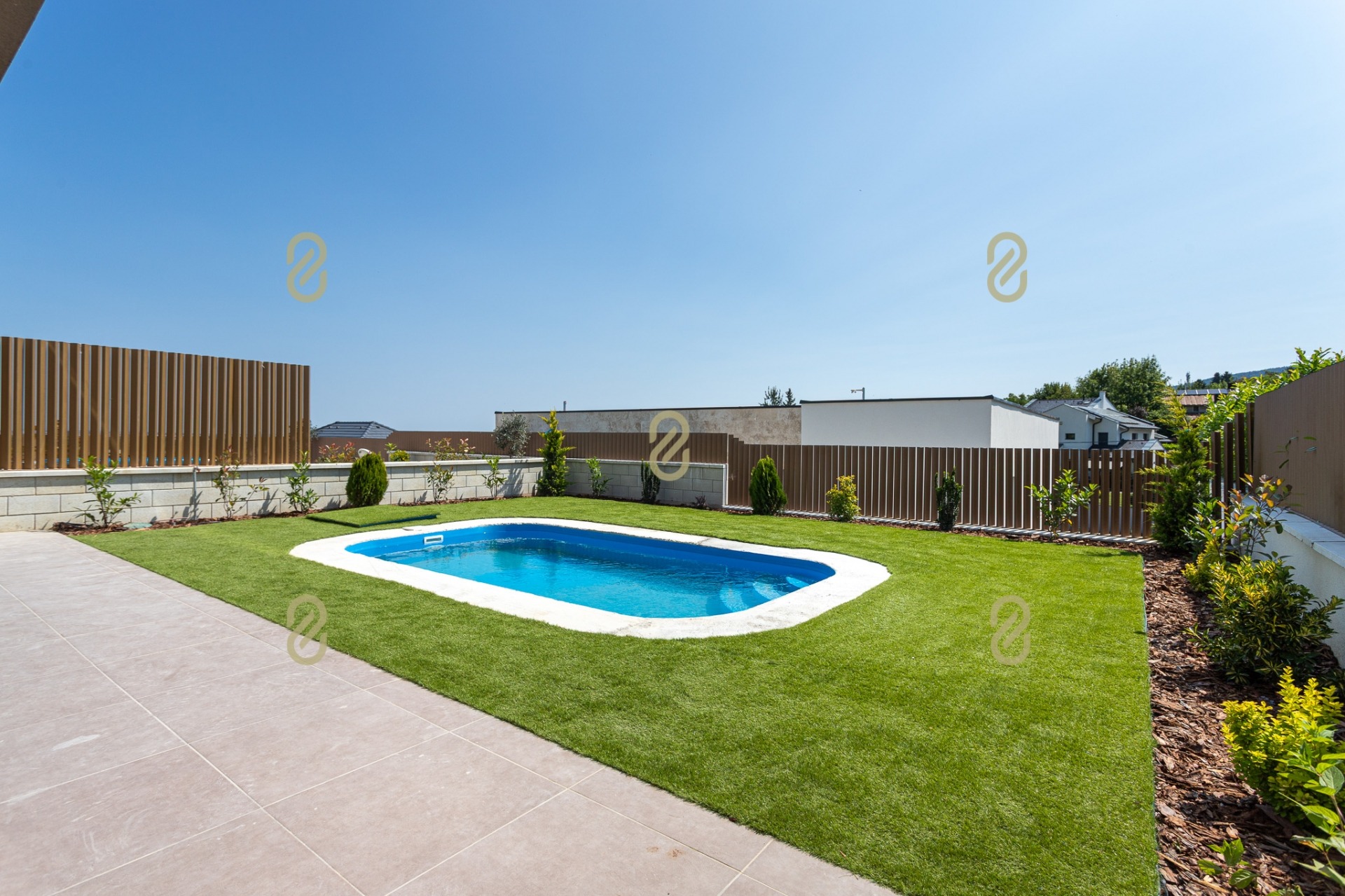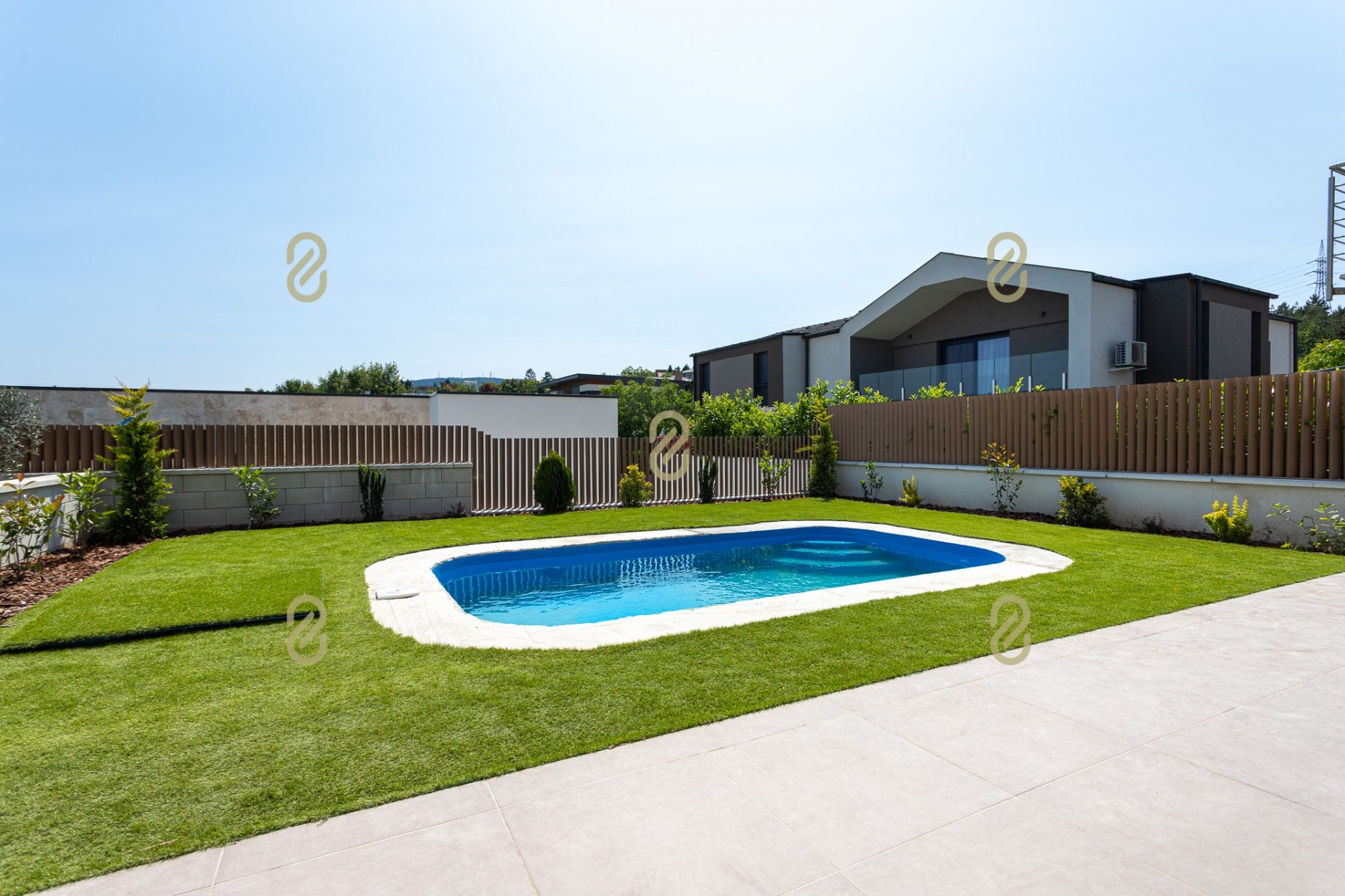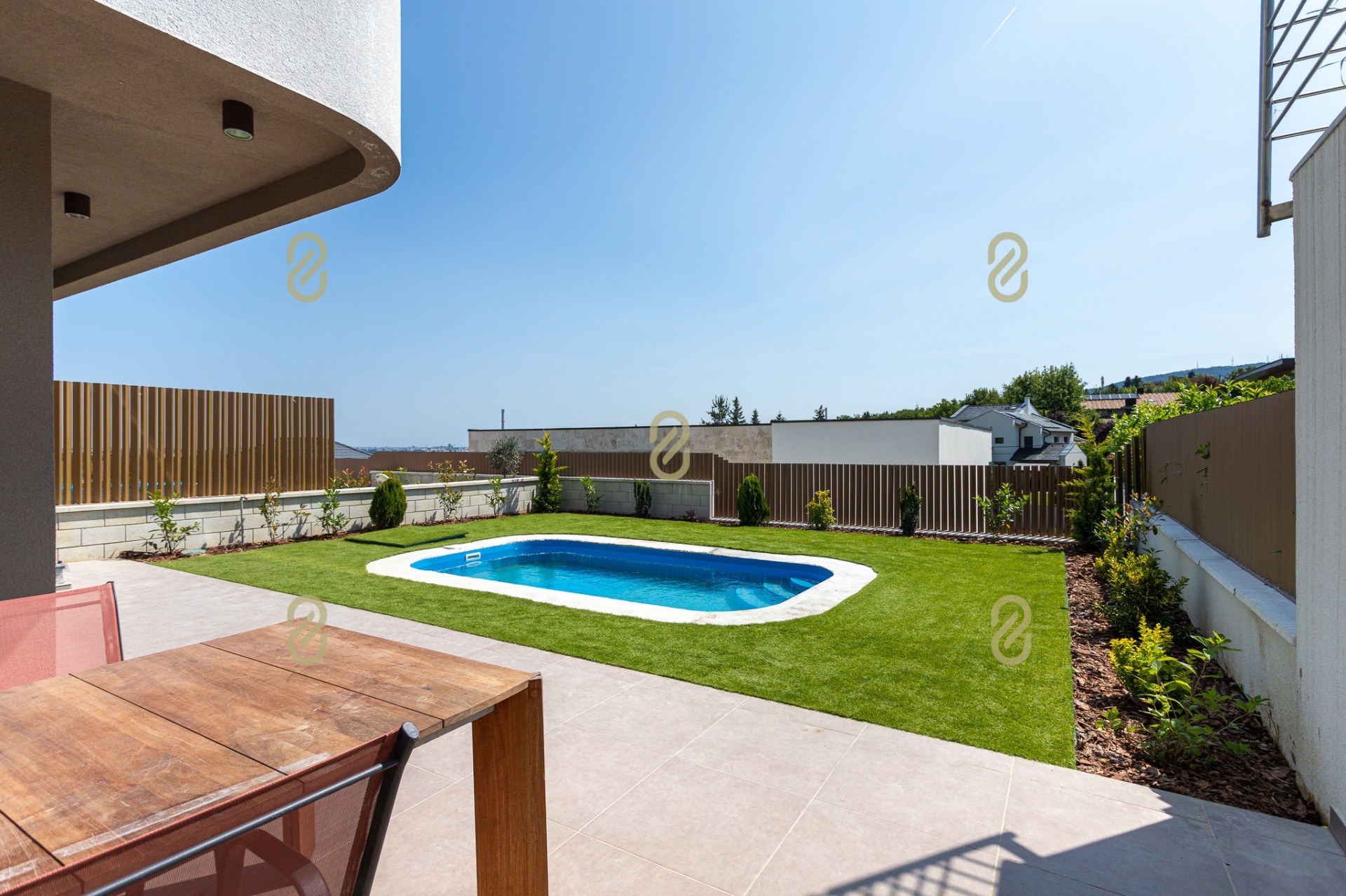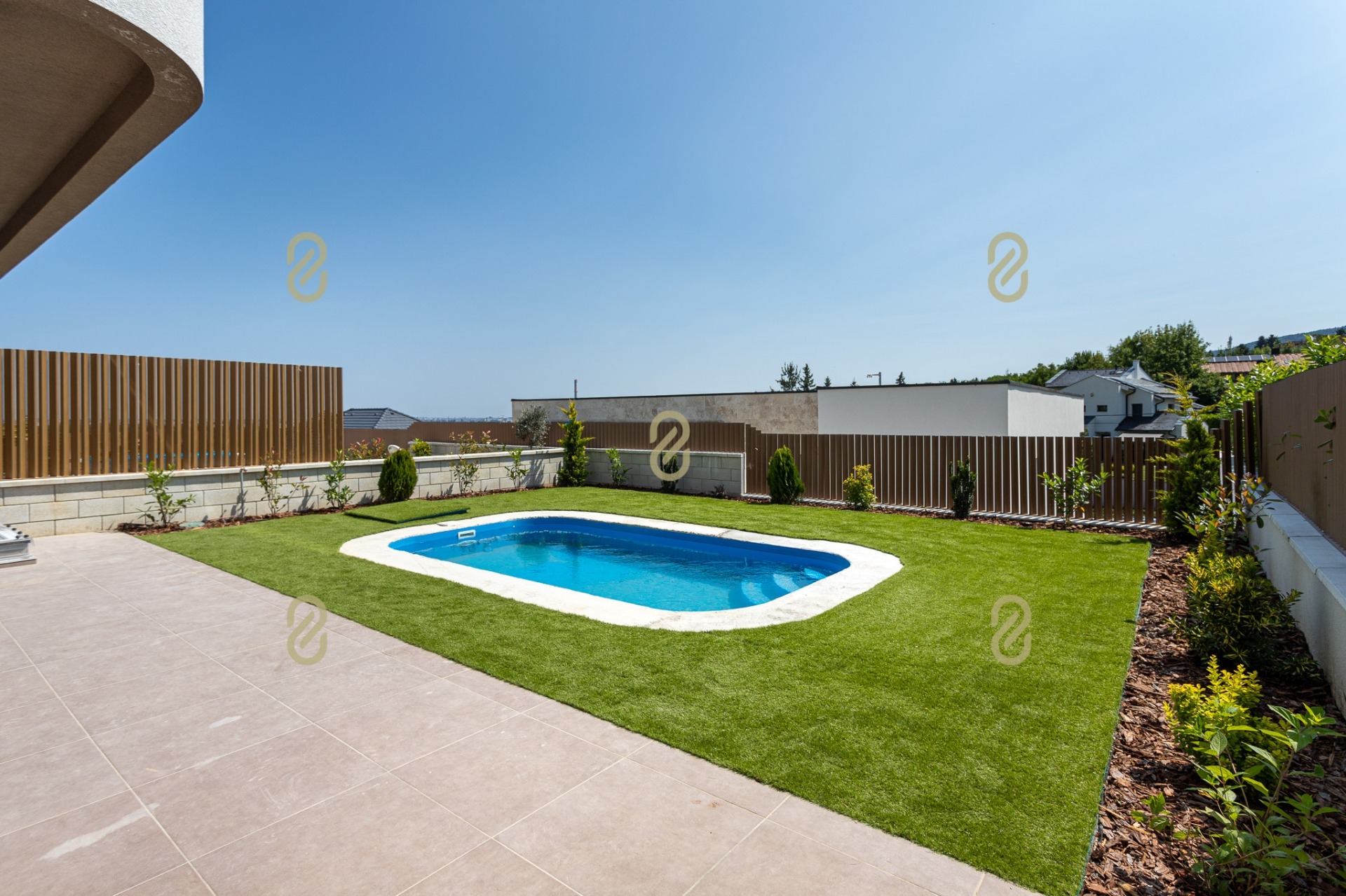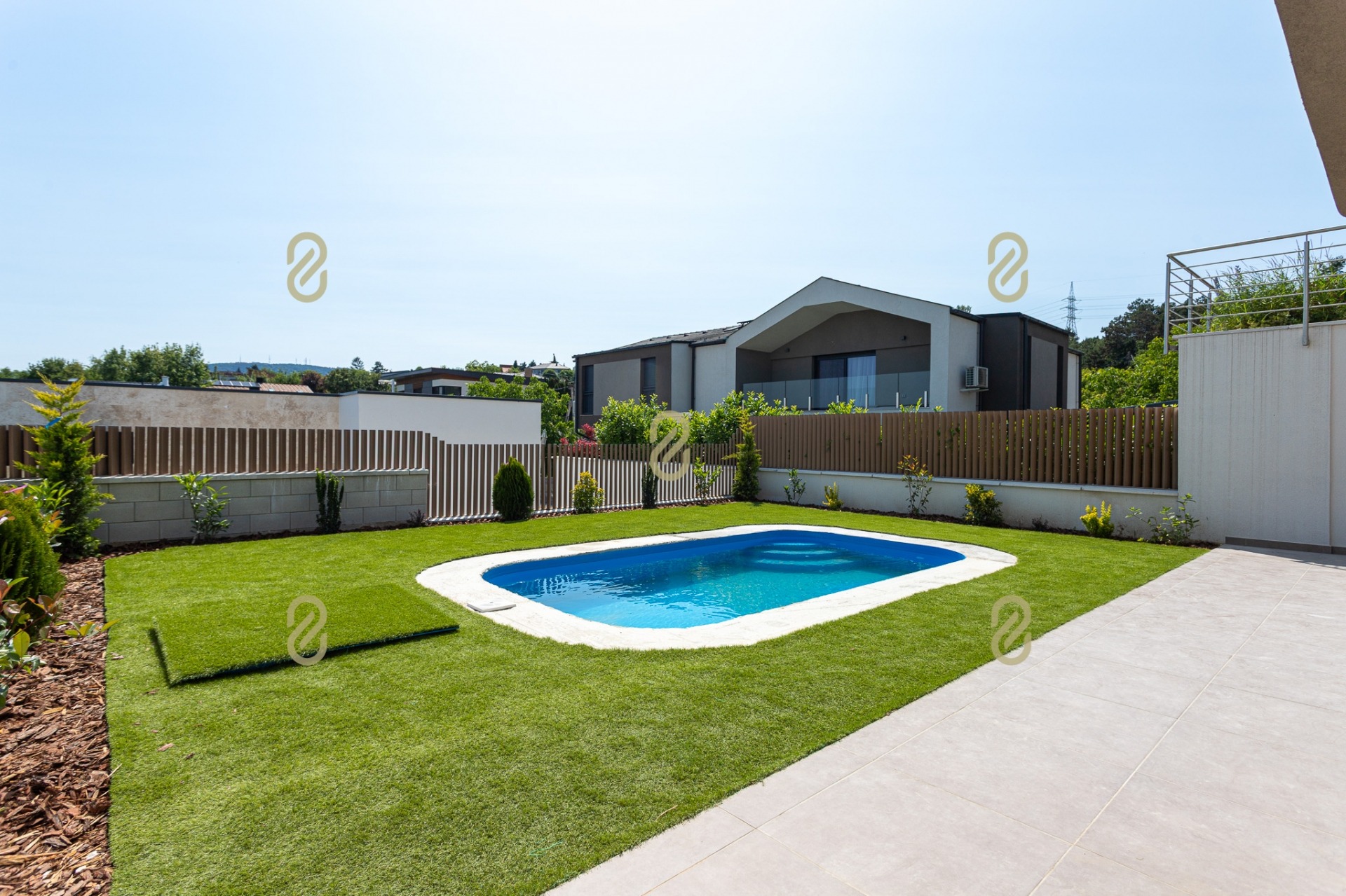 - 4,5 × 2,5 m-es medence, pergolás, világított terasz