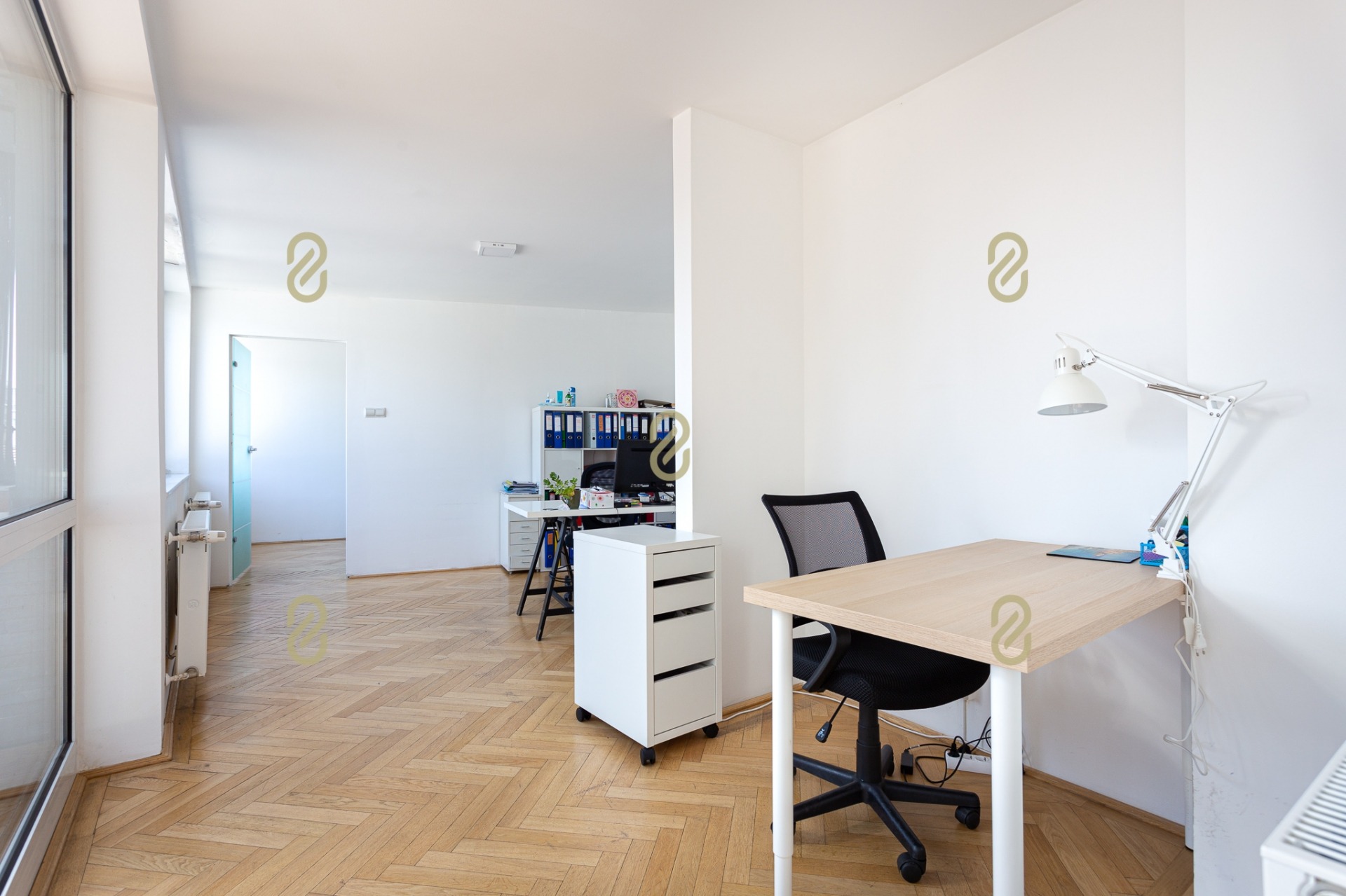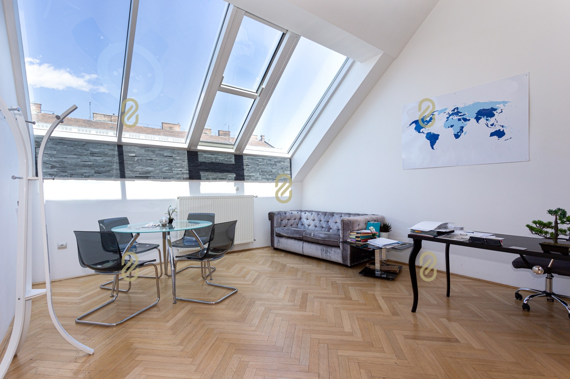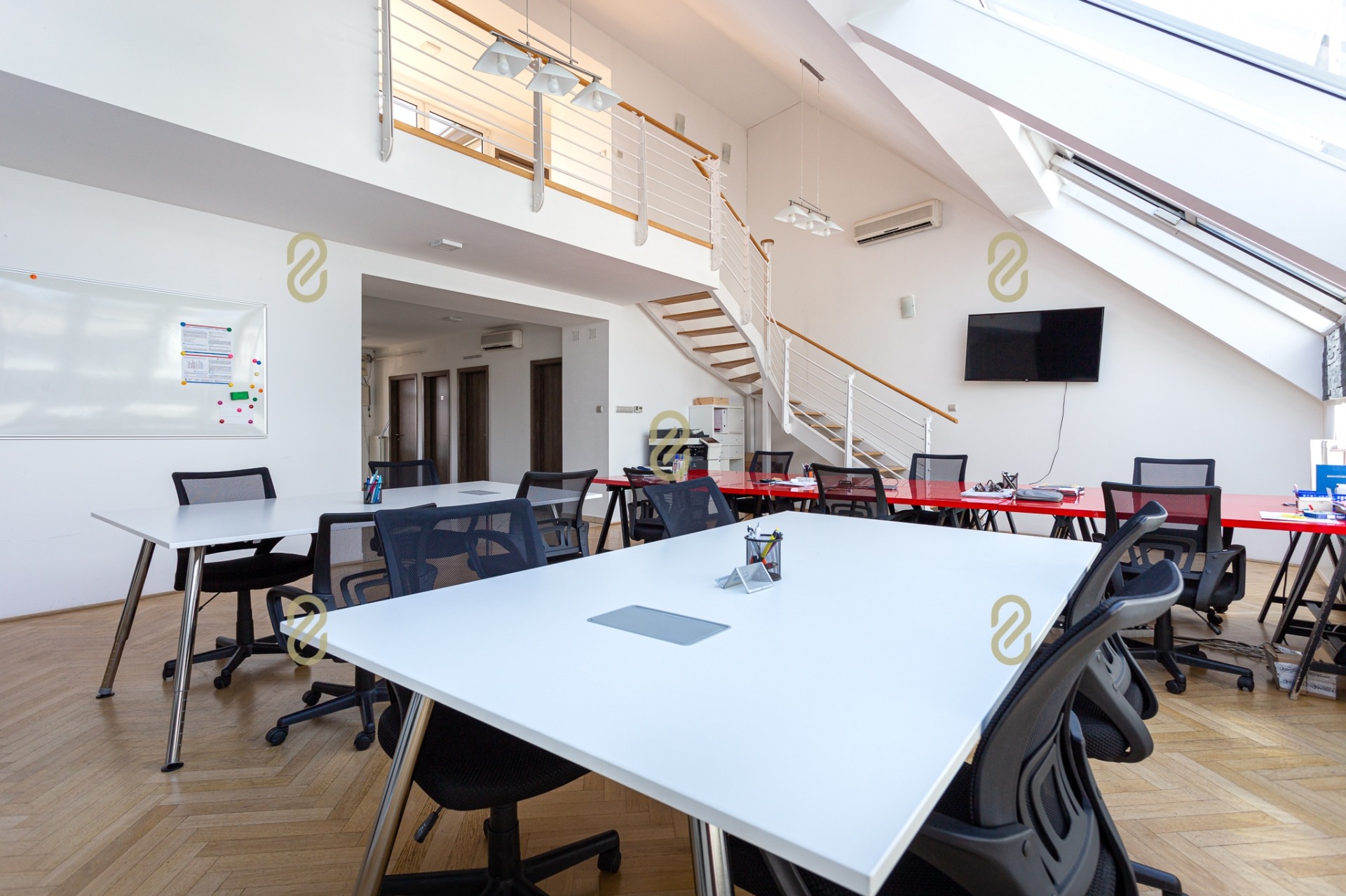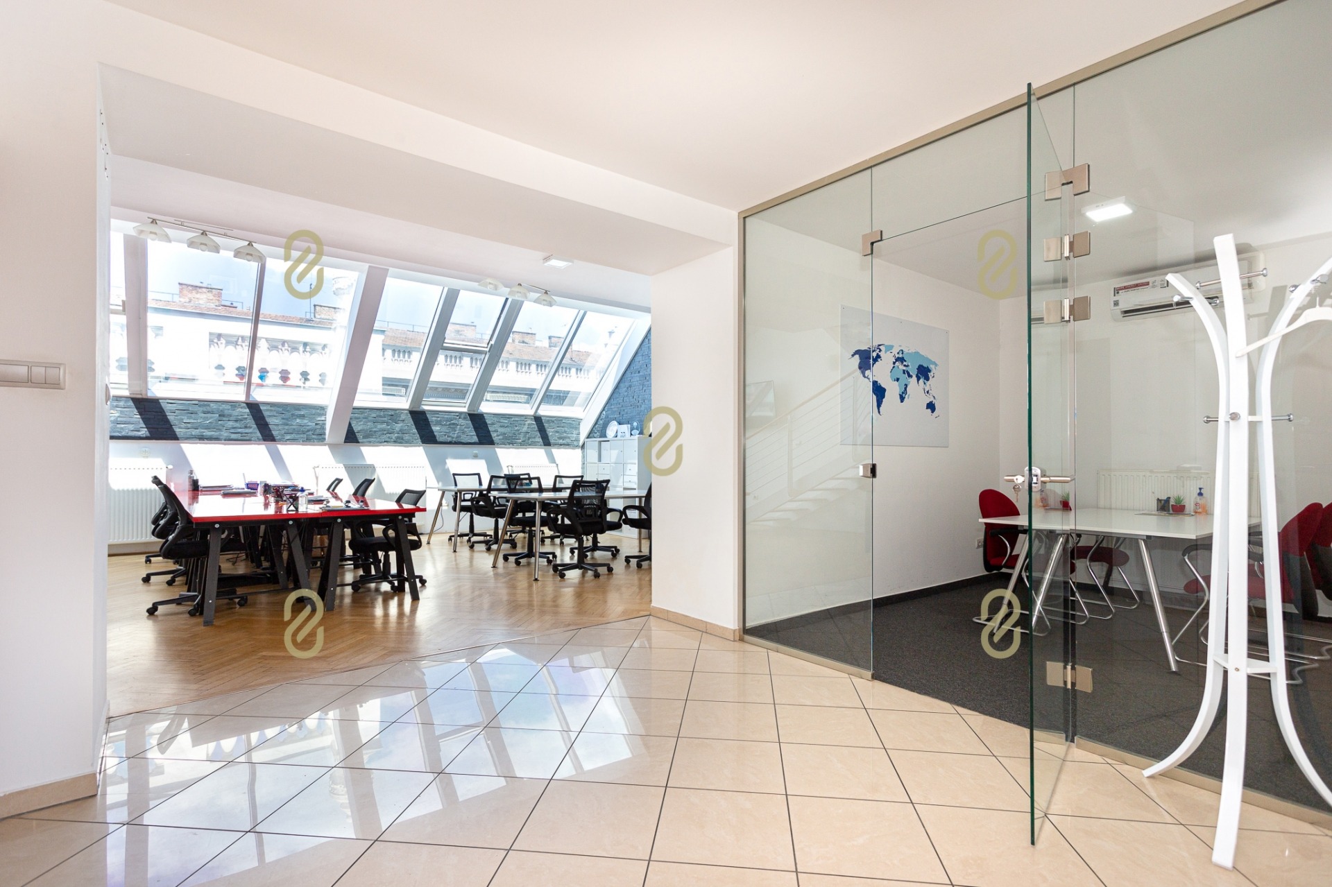 Belépve egy tágas előszobában találjuk magunkat, ahonnan jobbra egy konyha, illetve egy, a jelenlegi irodai funkció miatt kialakításra került tárgyaló található, balra pedig egy szoba/most iroda, egy fürdőszoba és egy gépészeti helyiség helyezkedik el benne. A bejárattal szemben egy hatalmas légterű közösségi helyiség/ lakásfunkció esetén nappali, valamint még egy külön iroda/szoba került kialakításra.
