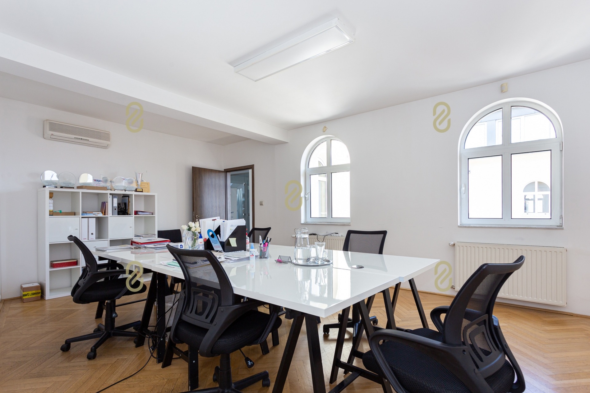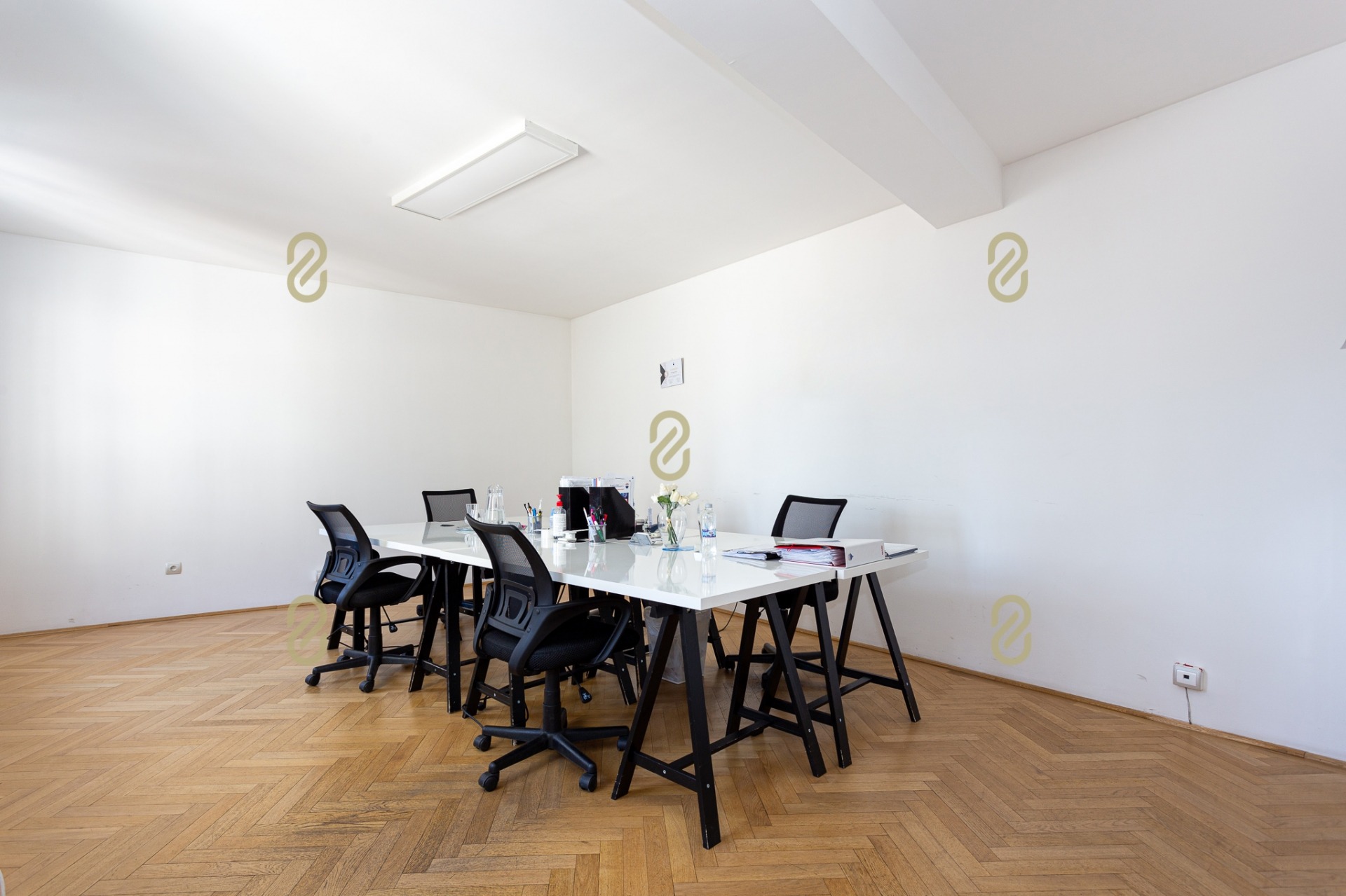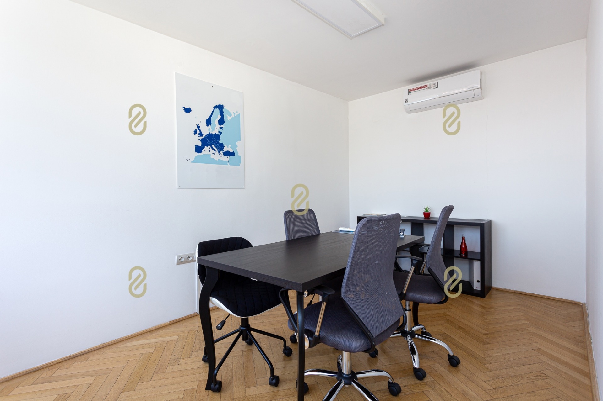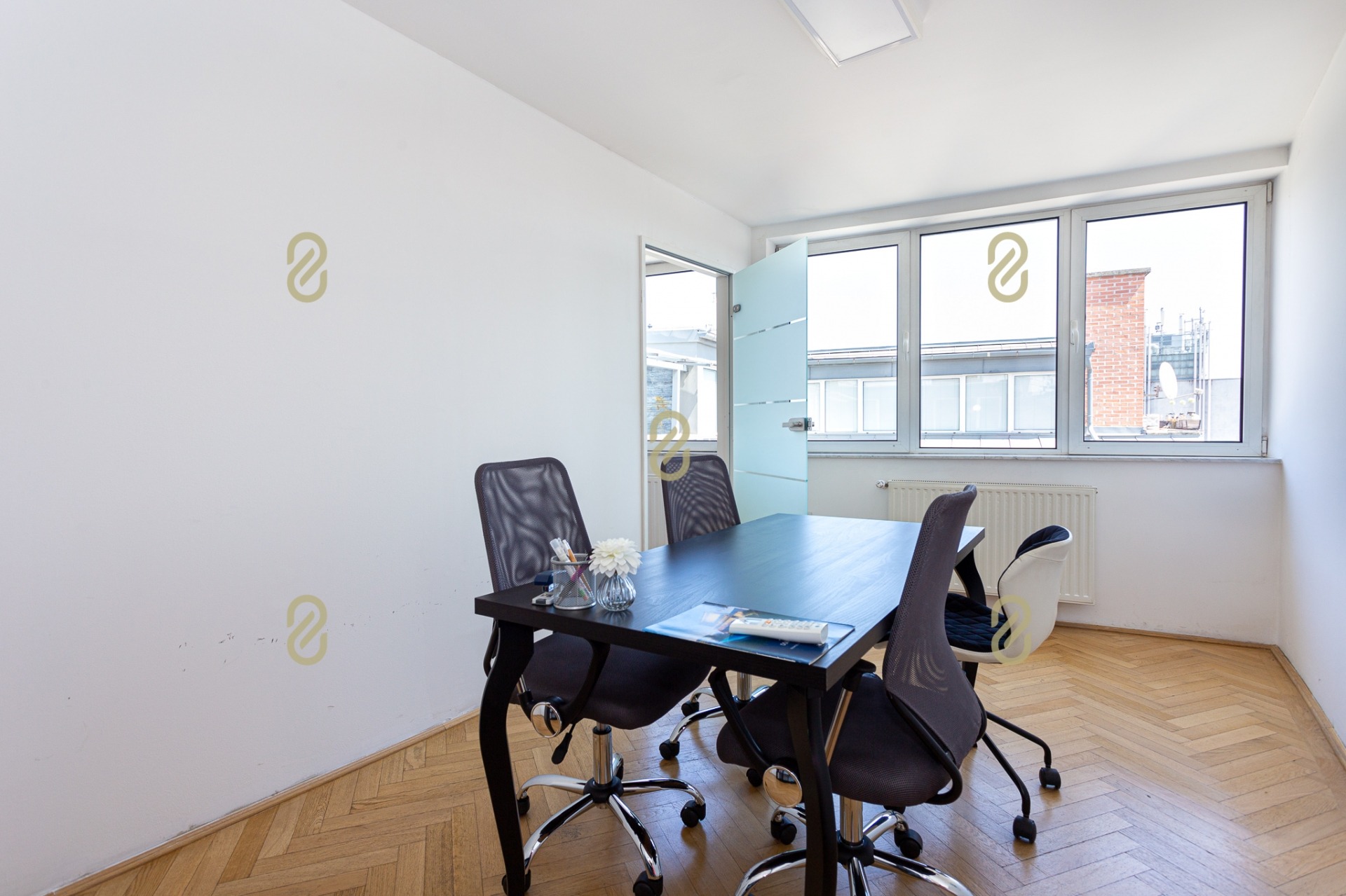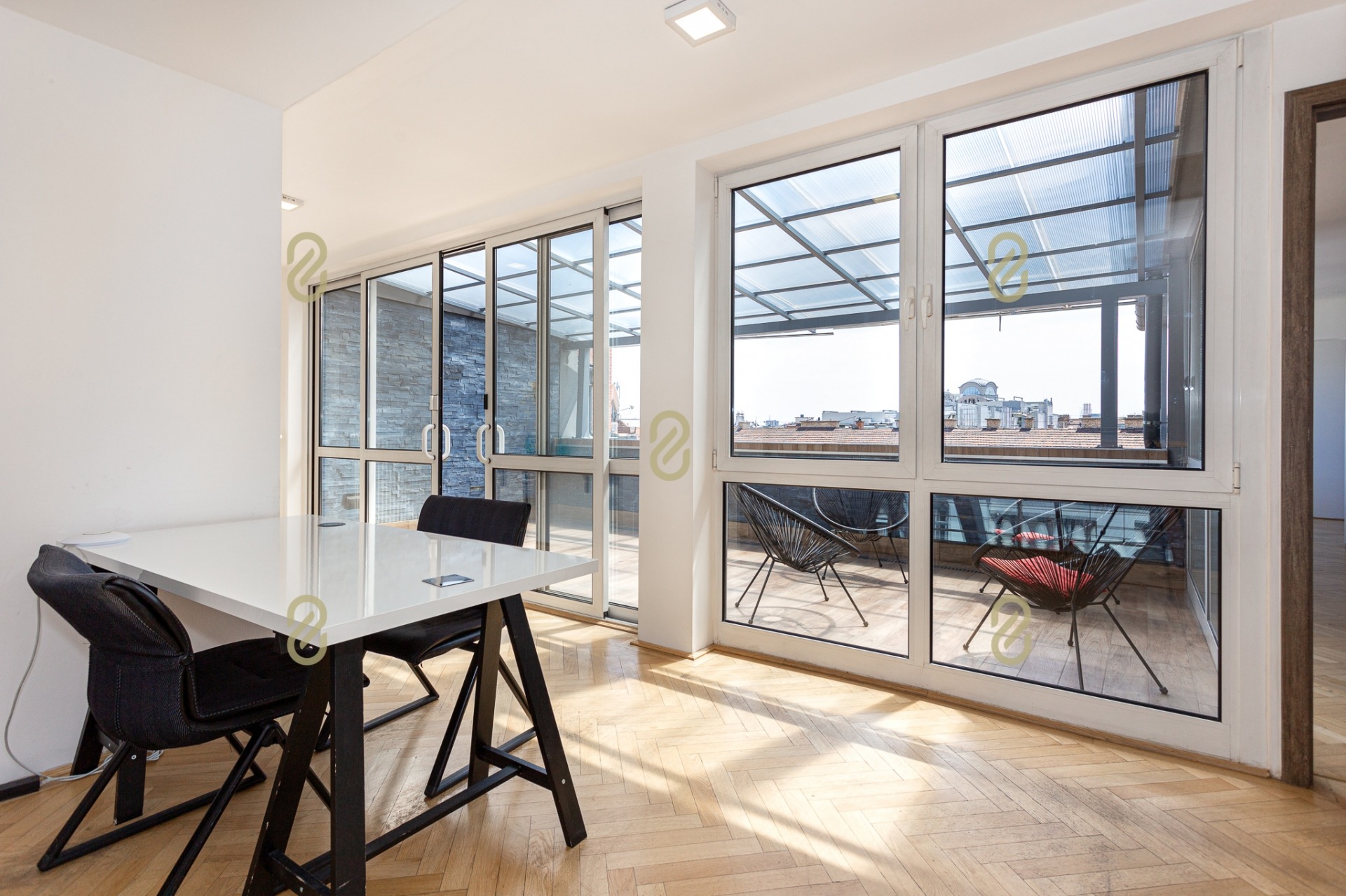 Belépve egy tágas előszobában találjuk magunkat, ahonnan jobbra egy konyha, illetve egy, a jelenlegi irodai funkció miatt kialakításra került tárgyaló található, balra pedig egy szoba/most iroda, egy fürdőszoba és egy gépészeti helyiség helyezkedik el benne. A bejárattal szemben egy hatalmas légterű közösségi helyiség/ lakásfunkció esetén nappali, valamint még egy külön iroda/szoba került kialakításra.