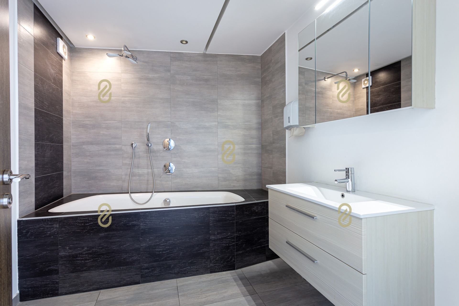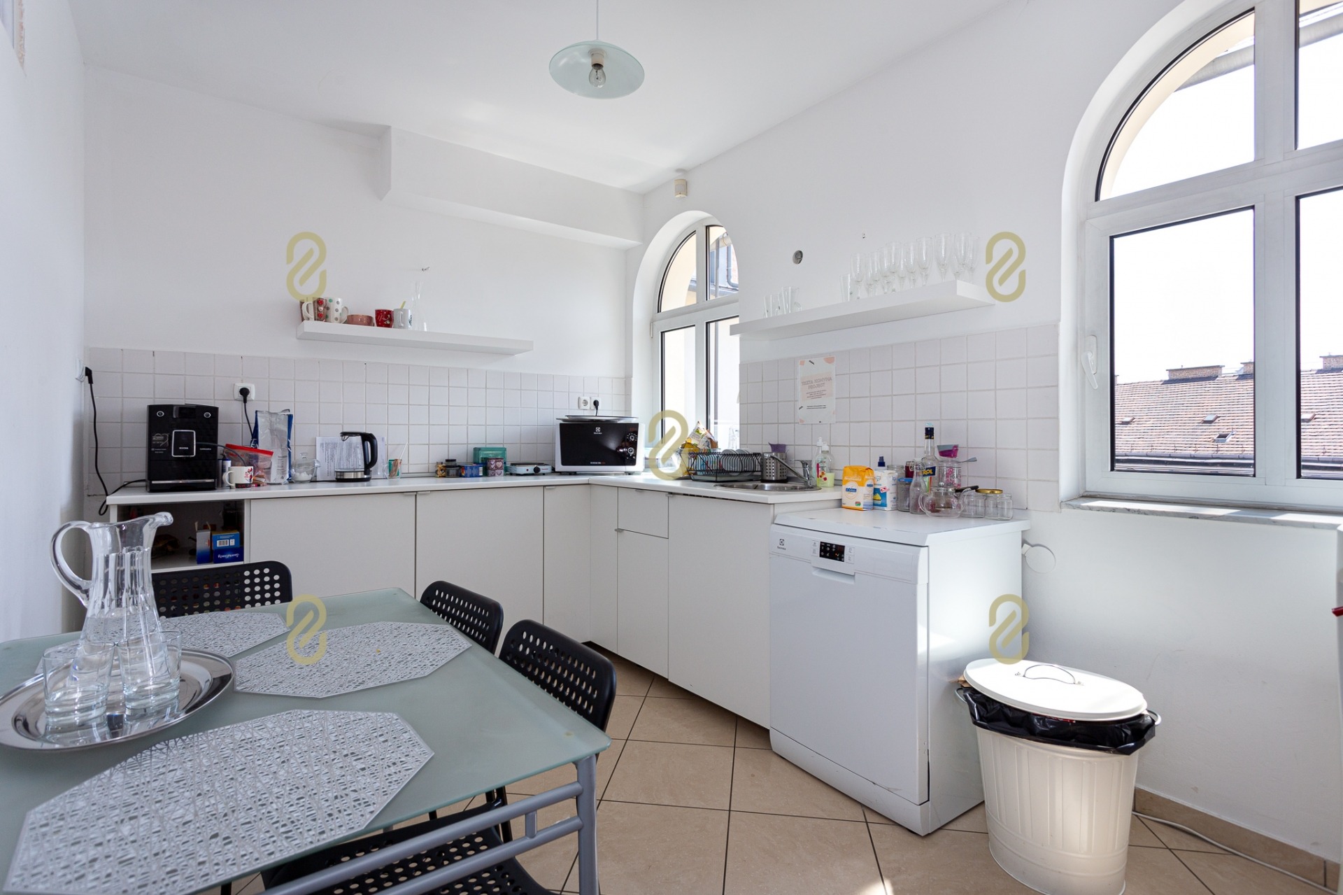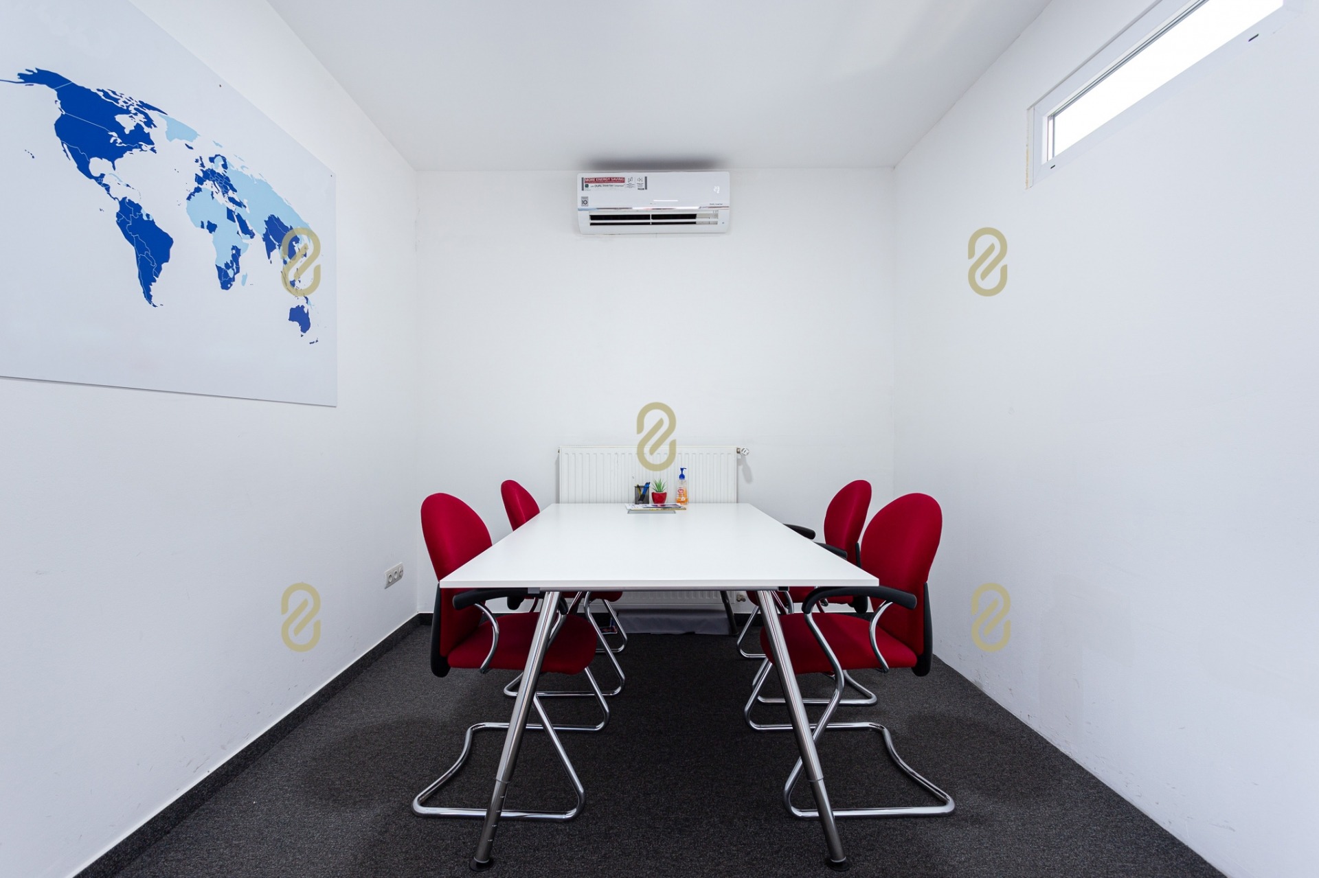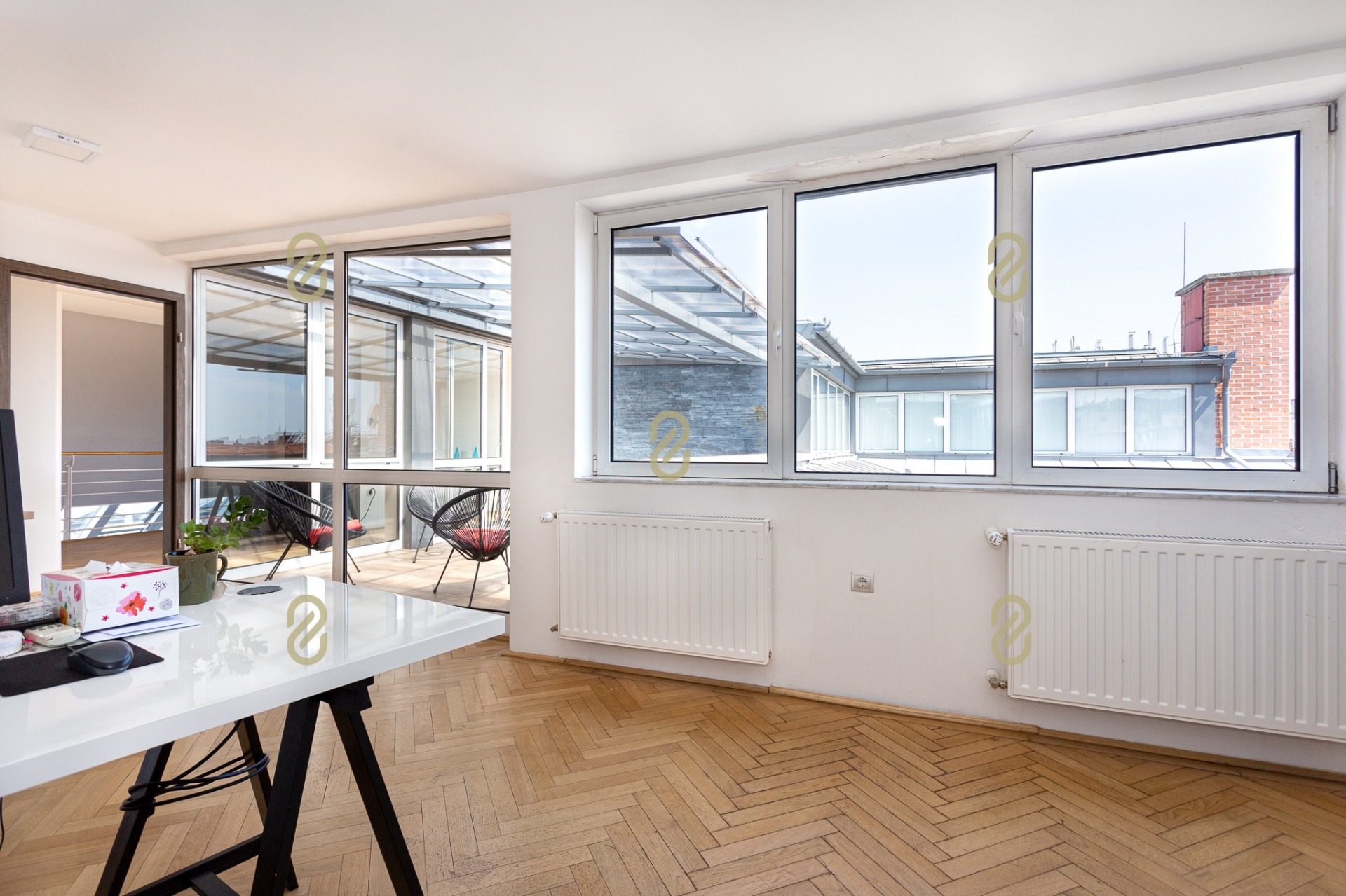 Belépve egy tágas előszobában találjuk magunkat, ahonnan jobbra egy konyha, illetve egy, a jelenlegi irodai funkció miatt kialakításra került tárgyaló található, balra pedig egy szoba/most iroda, egy fürdőszoba és egy gépészeti helyiség helyezkedik el benne. A bejárattal szemben egy hatalmas légterű közösségi helyiség/ lakásfunkció esetén nappali, valamint még egy külön iroda/szoba került kialakításra.