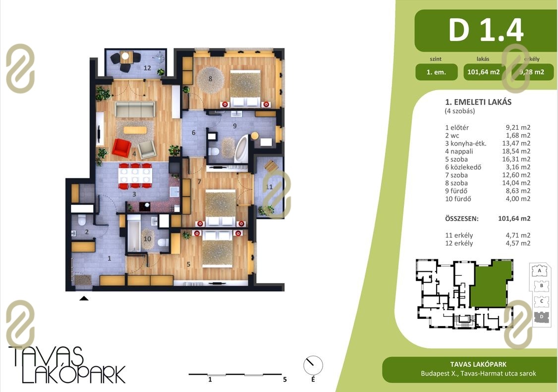 - Központi, energiahatékony hőszivattyús rendszer, padlófűtés, lakásonként egyedi méréssel.