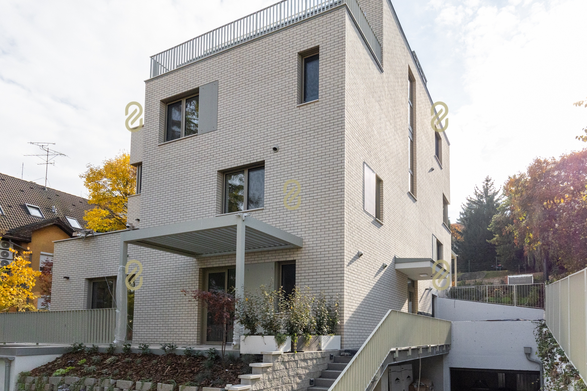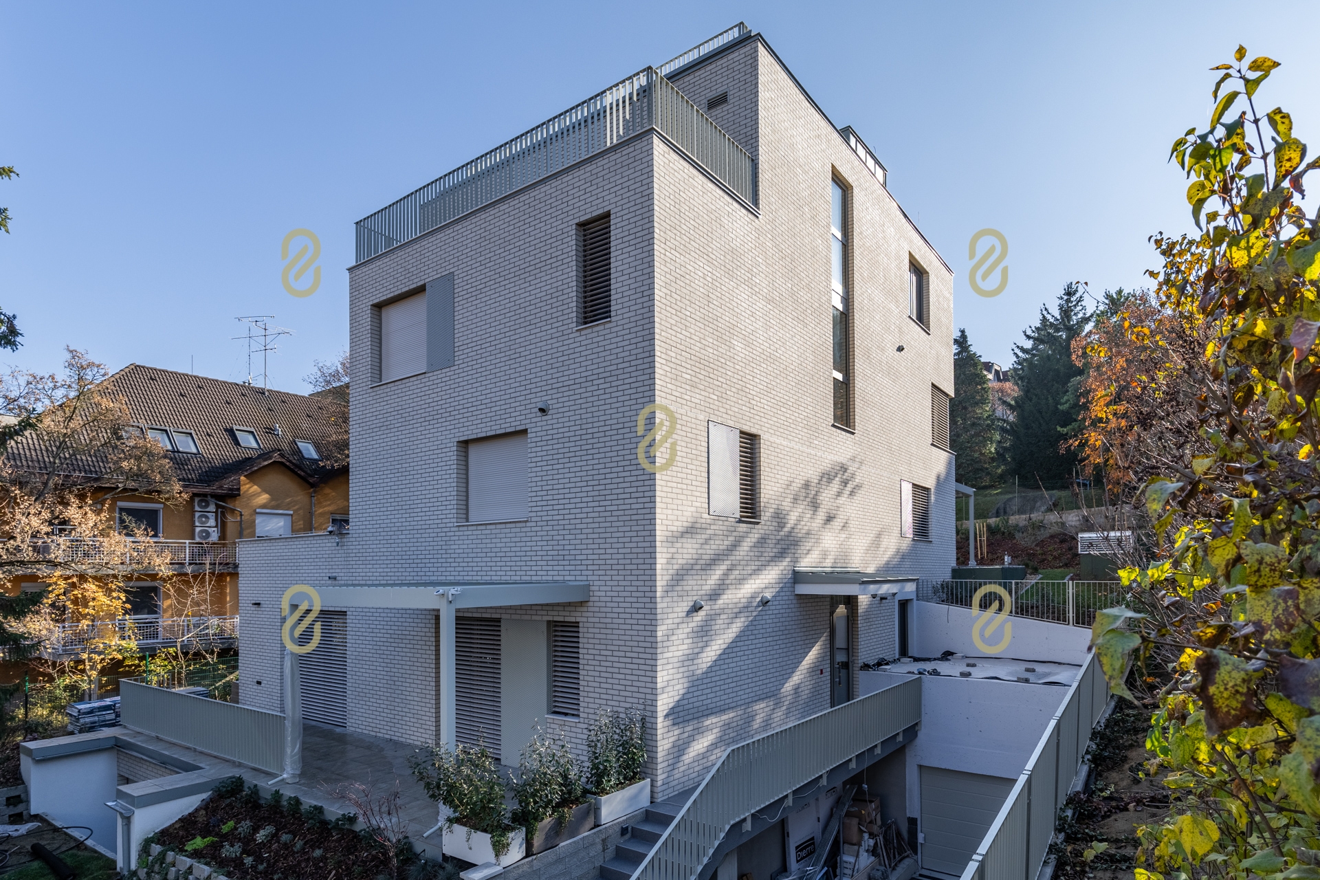 A kertek parkosítva, automata öntözőrendszer előkészítéssel, robotfűnyíróval kialakított gyeppel kerülnek átadásra, a teraszokat pedig bioklimatikus pergola teszi jól használhatóvá akár nyáron is.